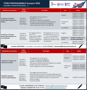 ■ Projet de formation (objectifs) : Dans le respect des différentes règlementations liées au transport terrestre de marchandises, l’Exploitant.e en Transport Routier de Marchandises organise l’ensemble de la prestation de transport de marchandises dans un souci d’optimisation des moyens et de satisfaction clientèle. ■ Sanction de la formation : Titre Professionnel niveau 4 (équivalent BAC) d’Exploitant […]
